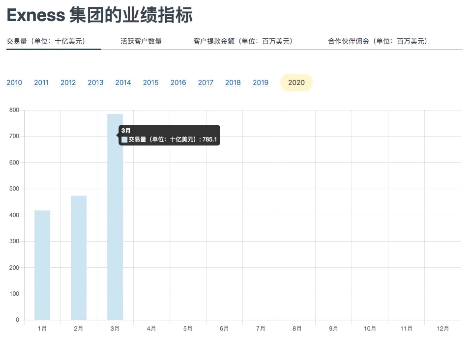 2020年3月份Exness集团的交易量达7,851亿美元,同比增长4,672亿美元,增长146.96%;环比增长3,113亿美元,增长65.70%,再创历史新高。