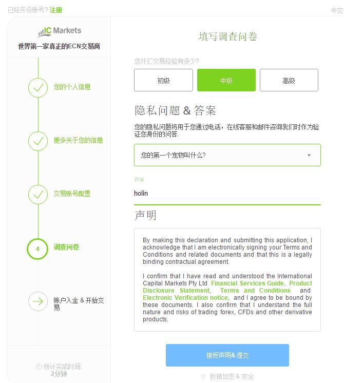 7 、选择自己的交易经验,设置自己的安全密码和问题。