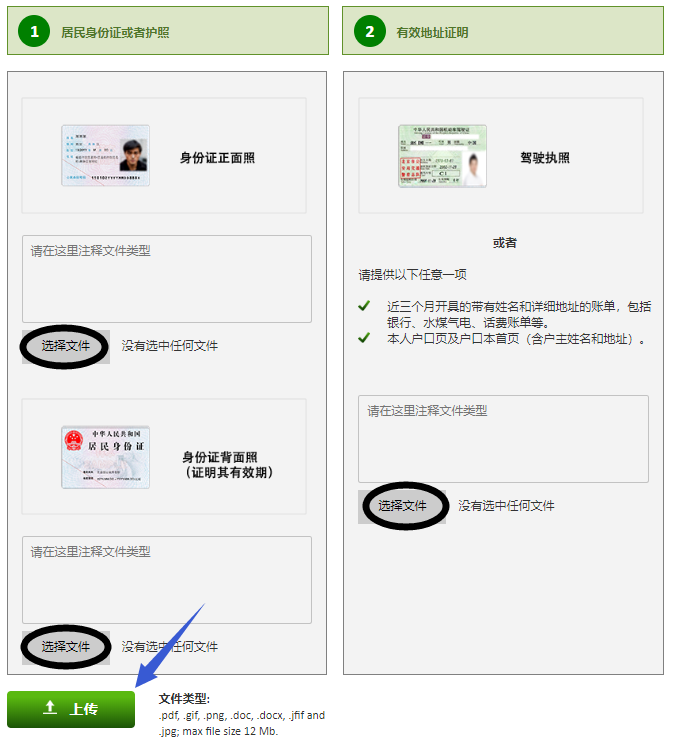 8、提交申请以后就会自动跳入客户安全专区,进入该页面以后,您需要上传开户所需上传的文件:身份证明和地址证明。